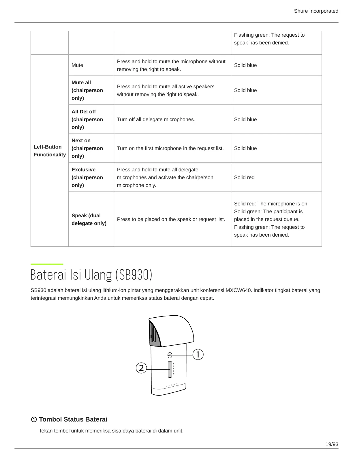 SB930 adalah baterai isi ulang lithium-ion pintar yang menggerakkan unit konferensi MXCW640. Indikator tingkat baterai yang