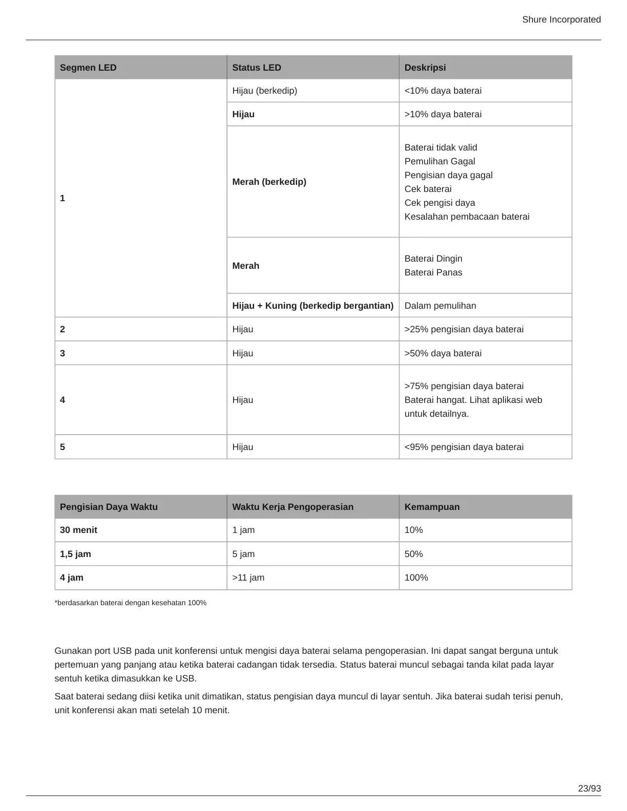 Gunakan port USB pada unit konferensi untuk mengisi daya baterai selama pengoperasian. Ini dapat sangat berguna untuk