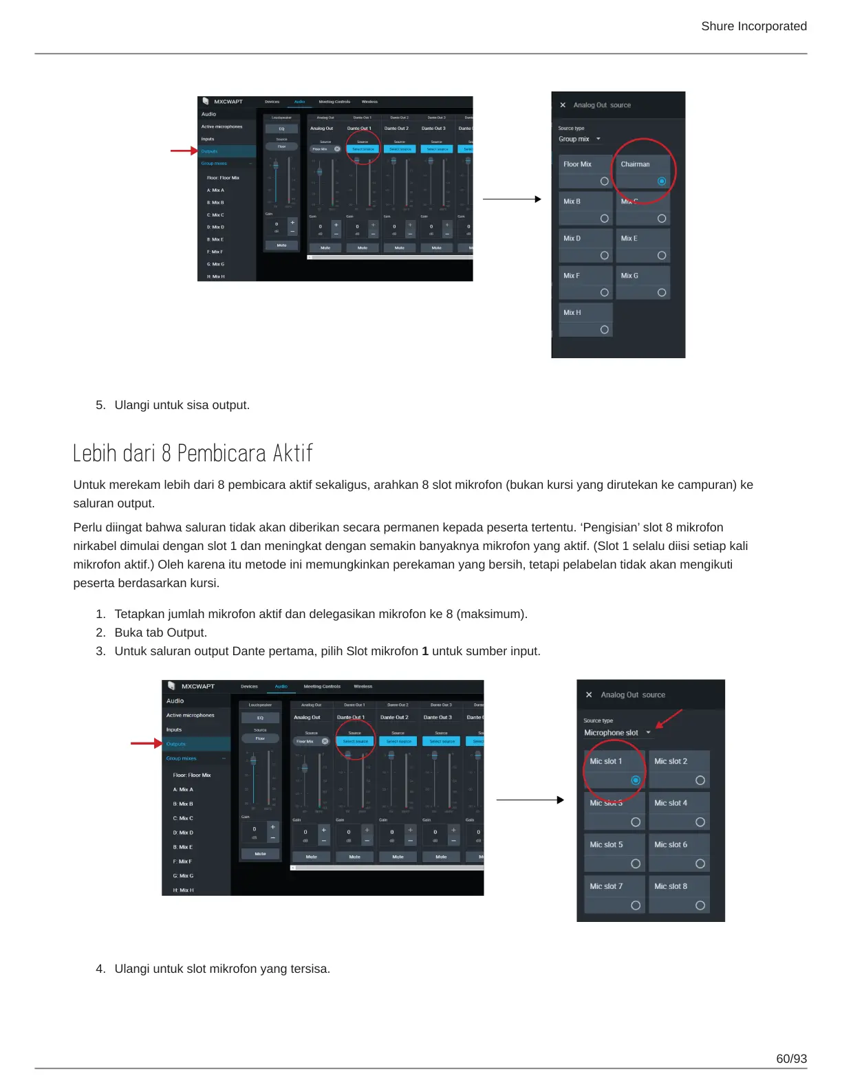 Untuk saluran output Dante pertama, pilih Slot mikrofon 1 untuk sumber input.
