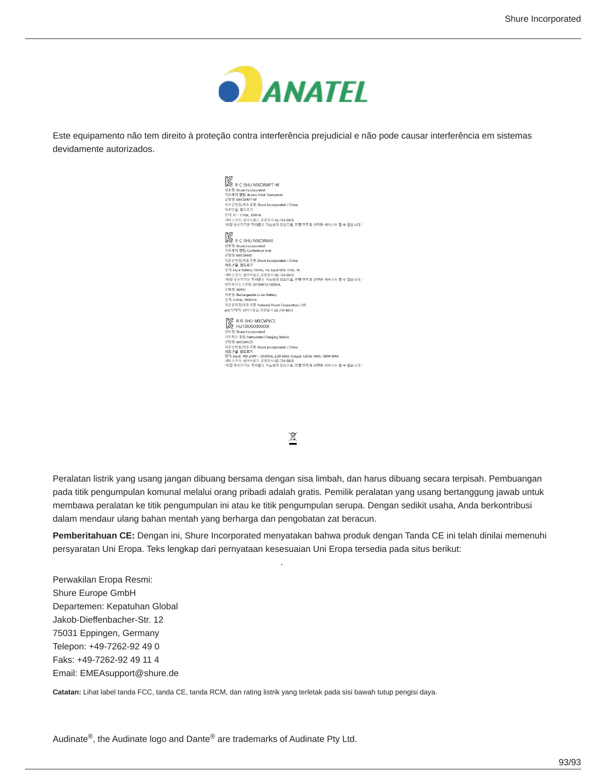 Pemberitahuan CE: Dengan ini, Shure Incorporated menyatakan bahwa produk dengan Tanda CE ini telah dinilai memenuhi
