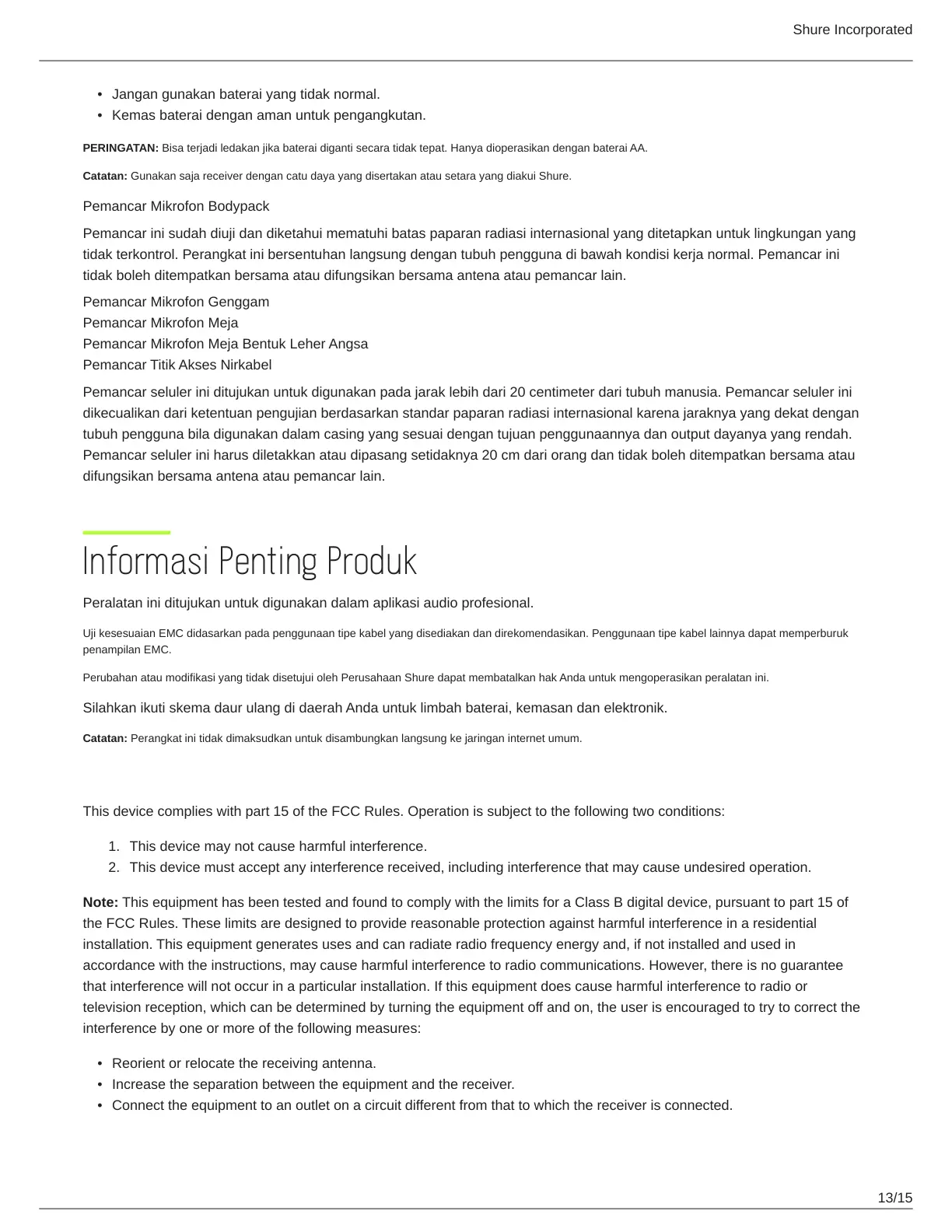 Perubahan atau modifikasi yang tidak disetujui oleh Perusahaan Shure dapat membatalkan hak Anda untuk mengoperasikan peralatan ini.