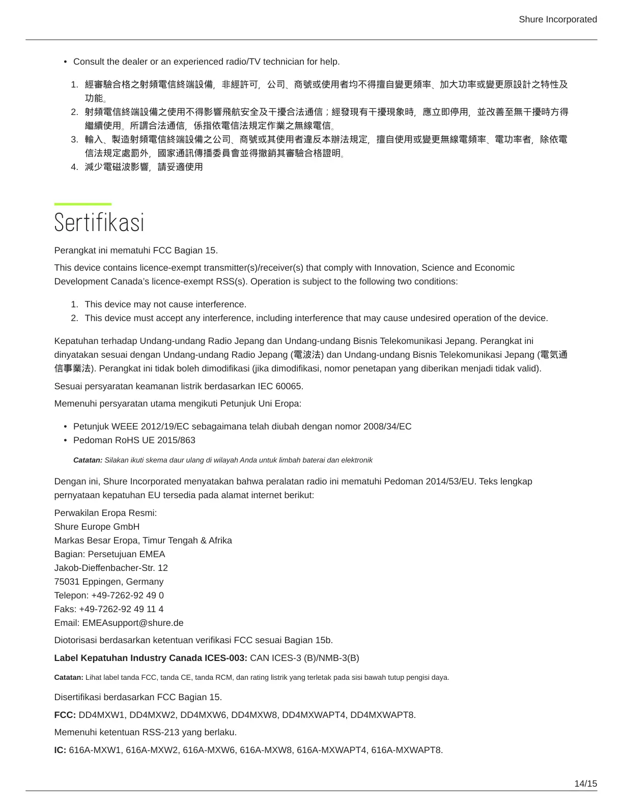 Dengan ini, Shure Incorporated menyatakan bahwa peralatan radio ini mematuhi Pedoman 2014/53/EU. Teks lengkap