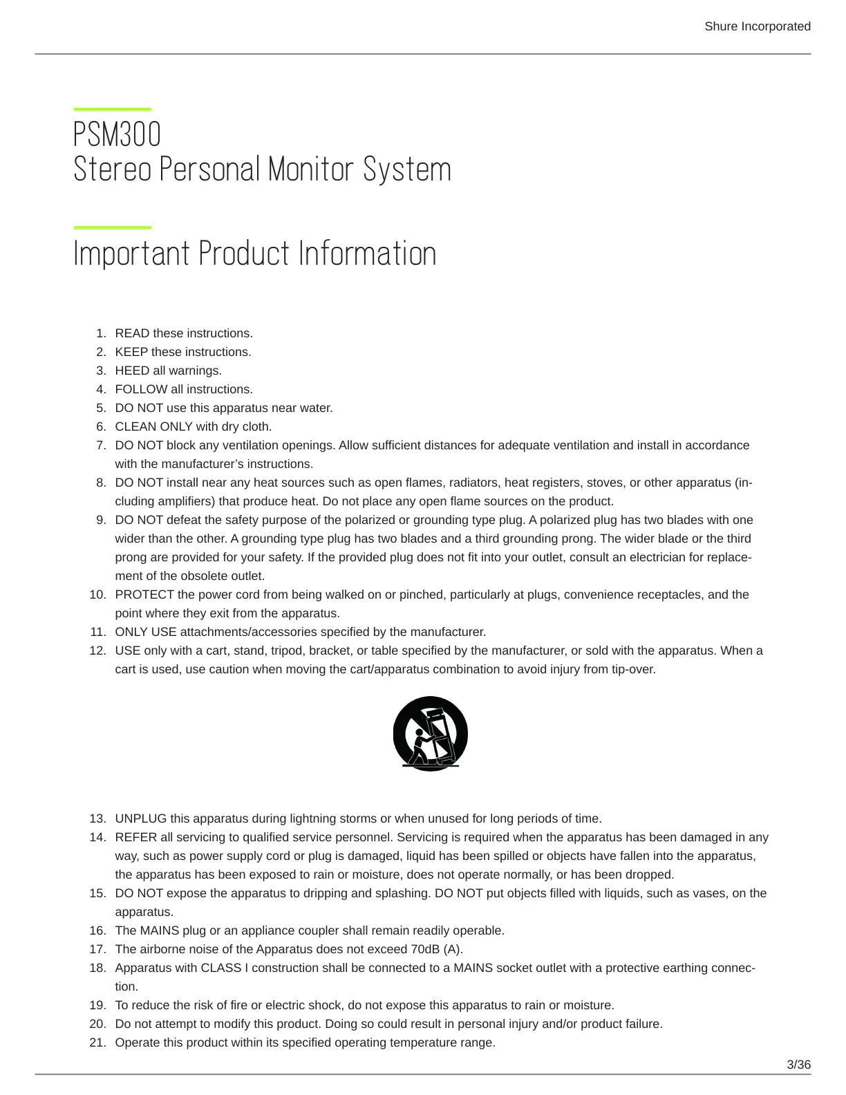cart is used, use caution when moving the cart/apparatus combination to avoid injury from tip-over.