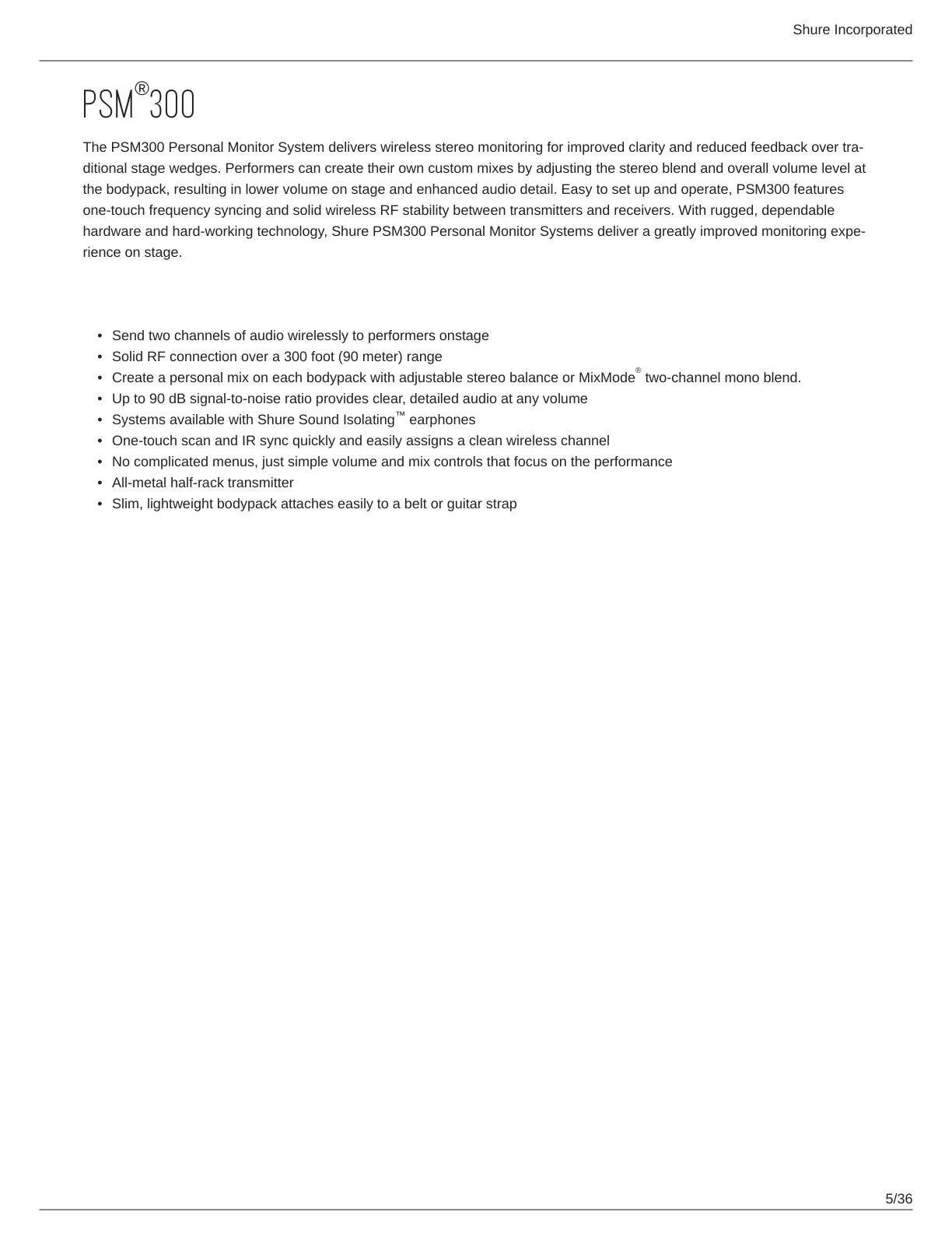 the bodypack, resulting in lower volume on stage and enhanced audio detail. Easy to set up and operate, PSM300 features