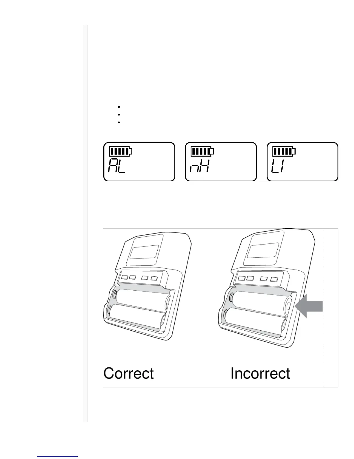 Fully insert the batteries as shown to ensure proper battery contact and to allow the door to latch