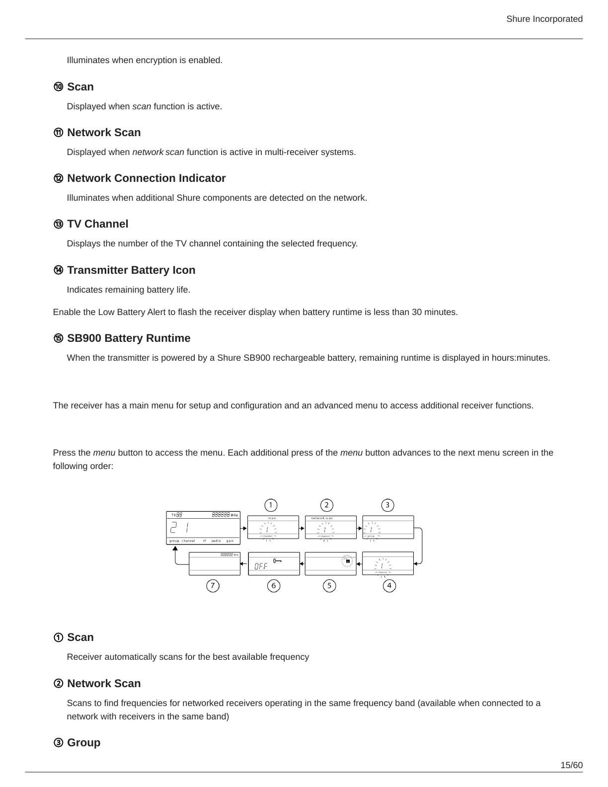 When the transmitter is powered by a Shure SB900 rechargeable battery, remaining runtime is displayed in hours:minutes.