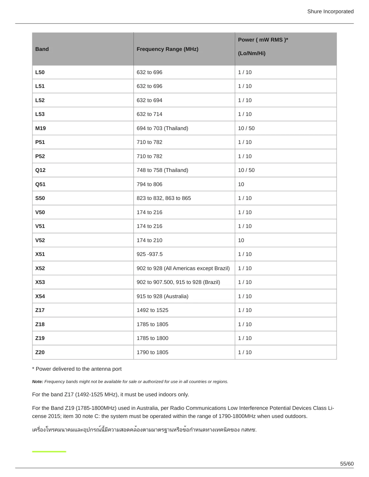 For the Band Z19 (17851800MHz) used in Australia, per Radio Communications Low Interference Potential Devices Class Li