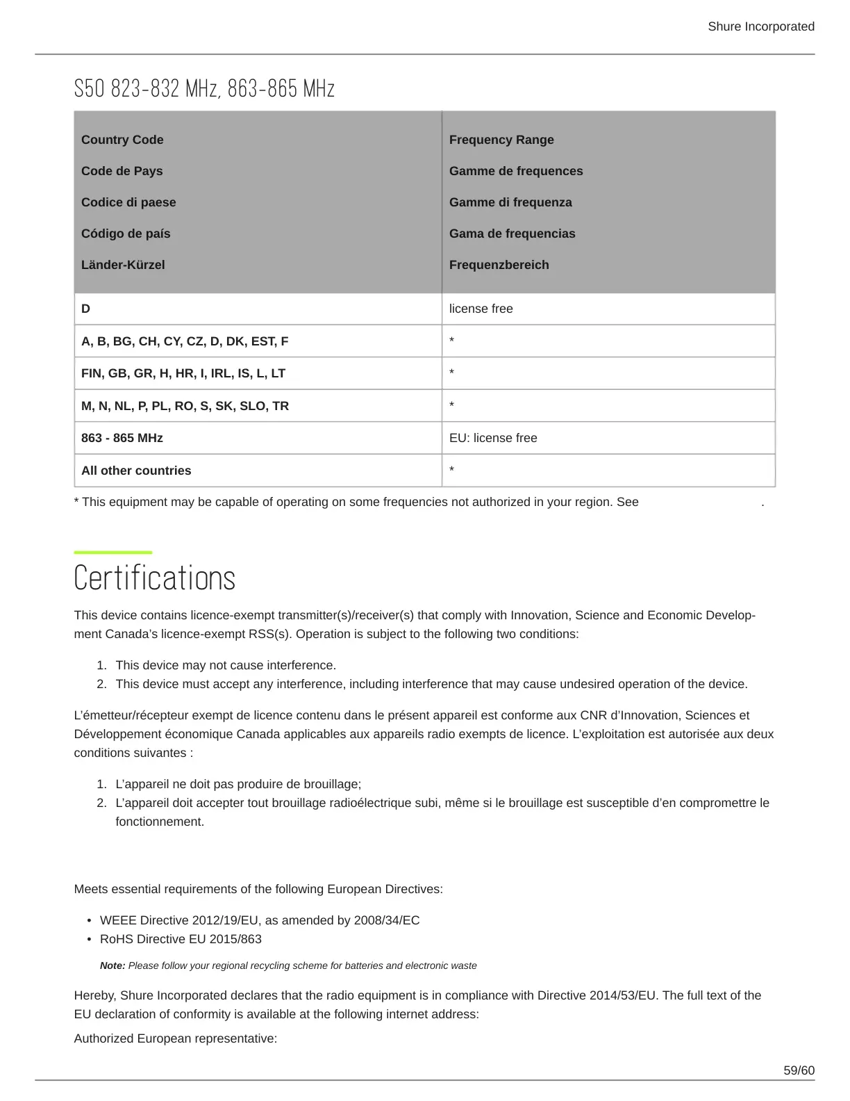 EU declaration of conformity is available at the following internet address: http://www.shure.com/europe/compliance