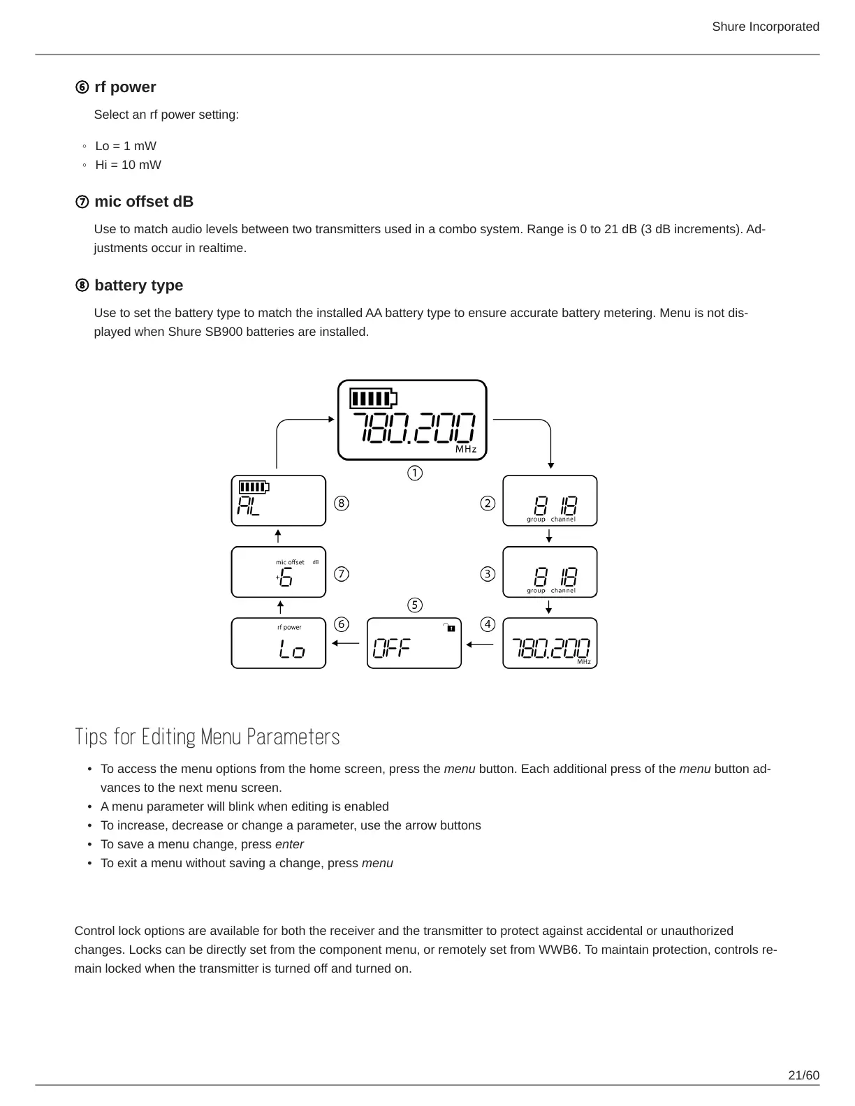 changes. Locks can be directly set from the component menu, or remotely set from WWB6. To maintain protection, controls re