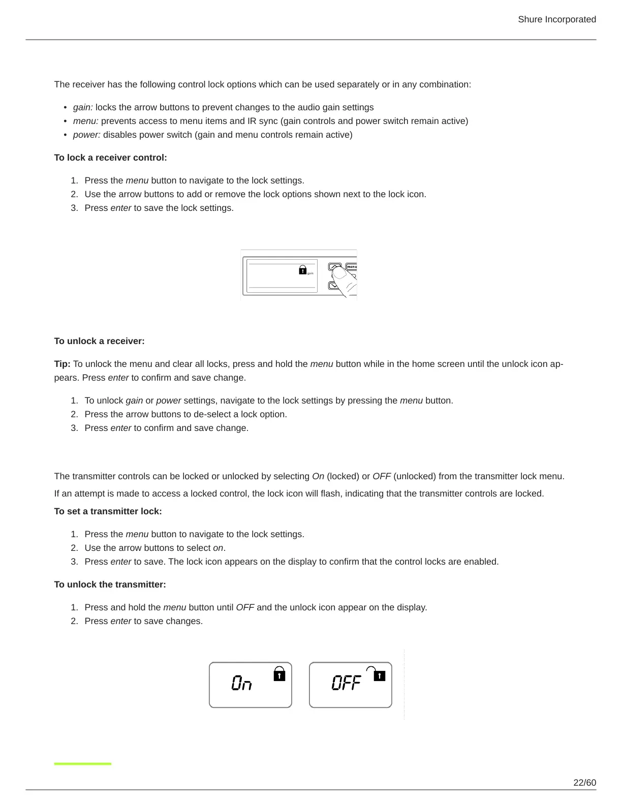 The transmitter controls can be locked or unlocked by selecting On (locked) or OFF (unlocked) from the transmitter lock menu.