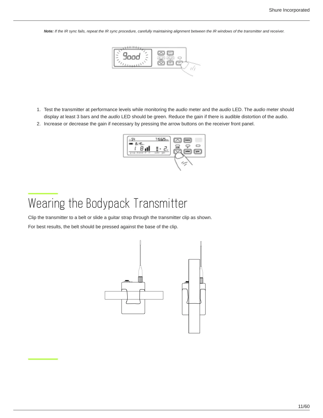 Clip the transmitter to a belt or slide a guitar strap through the transmitter clip as shown.