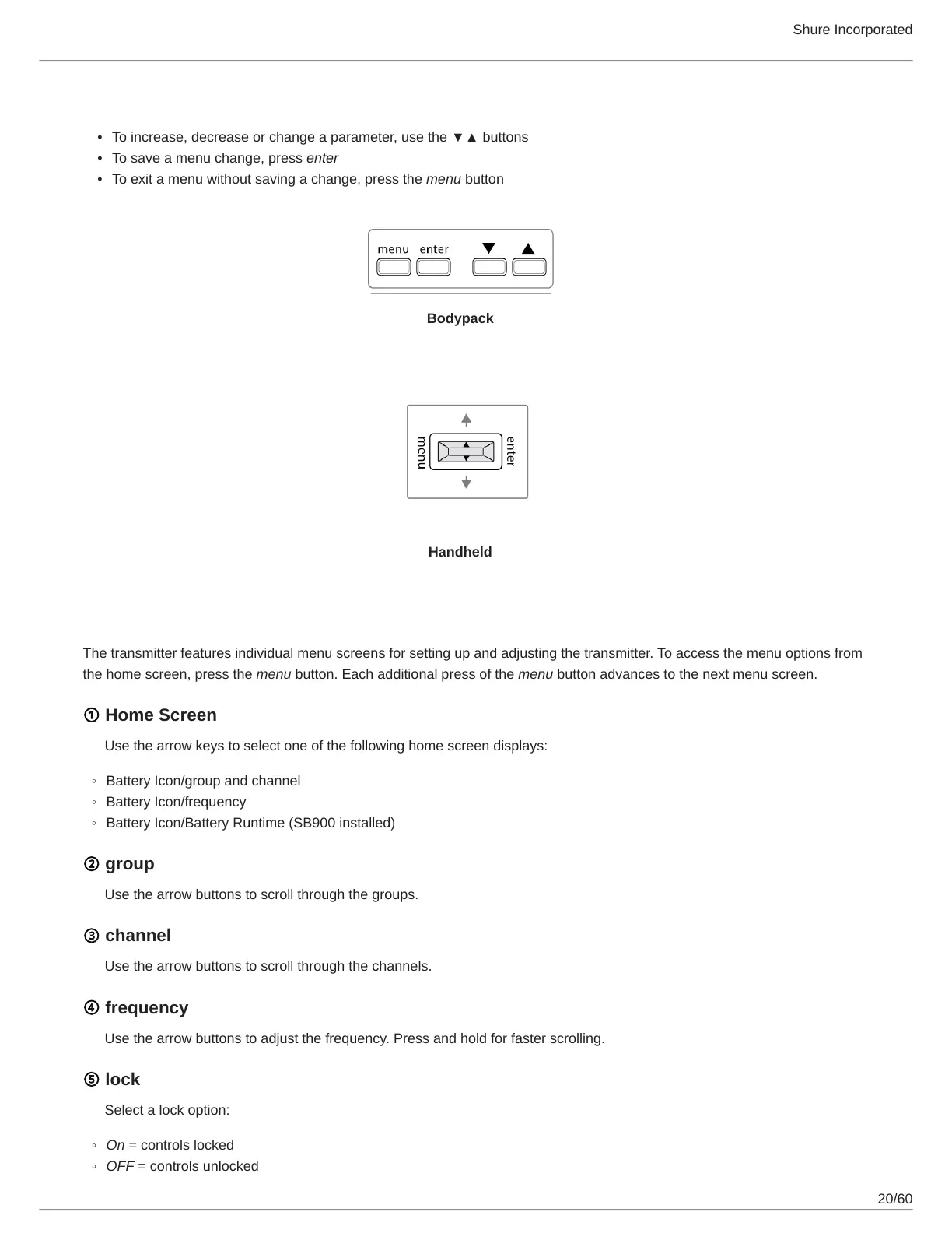 The transmitter features individual menu screens for setting up and adjusting the transmitter. To access the menu options from