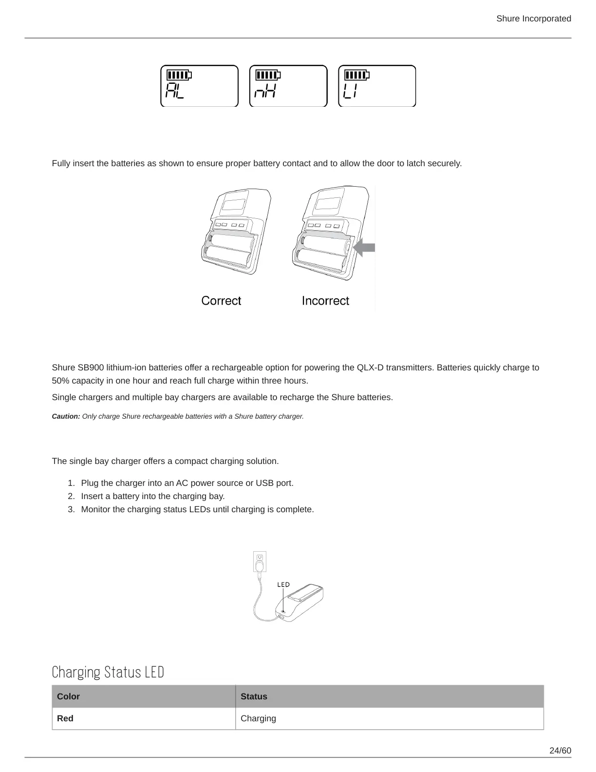 Caution: Only charge Shure rechargeable batteries with a Shure battery charger.