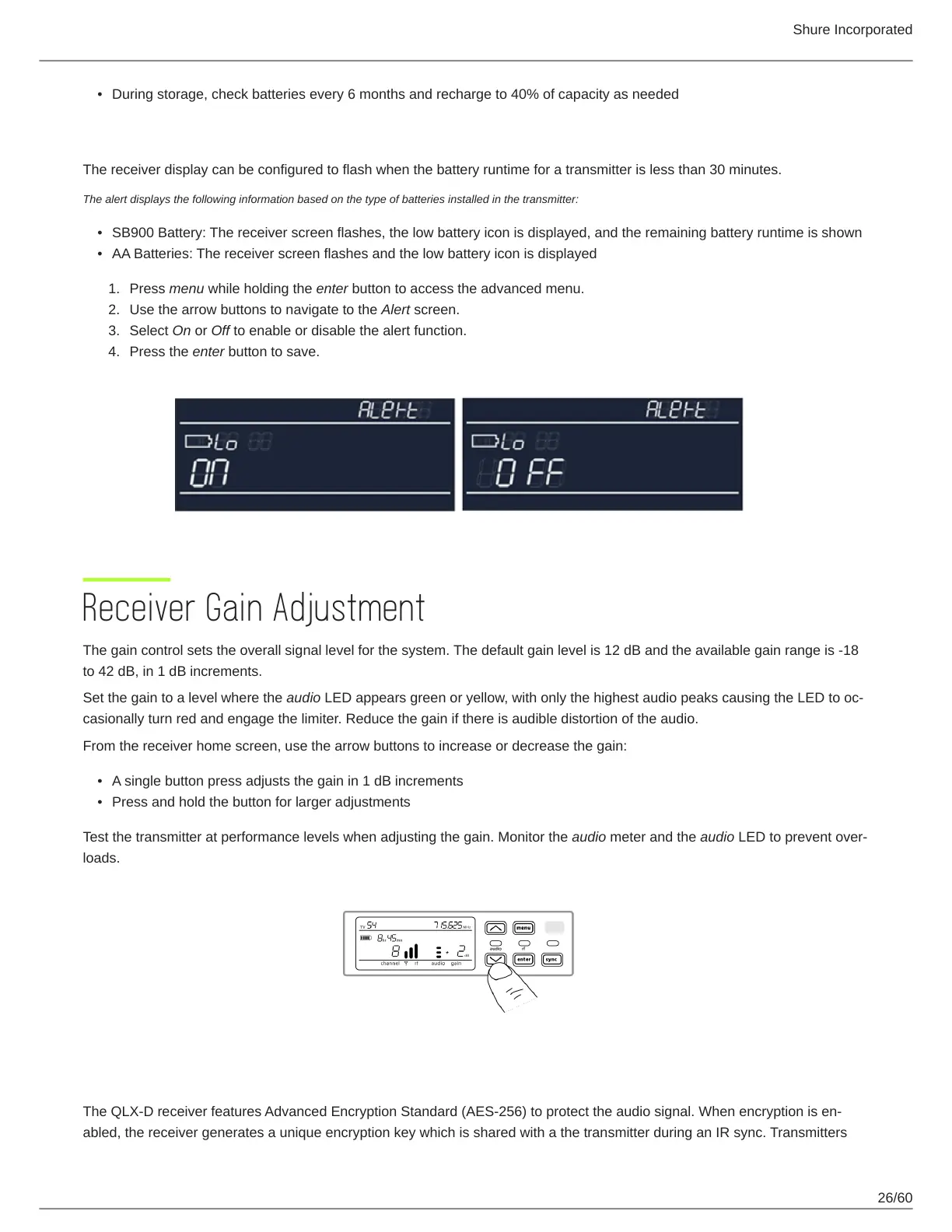 The QLXD receiver features Advanced Encryption Standard (AES256) to protect the audio signal. When encryption is en