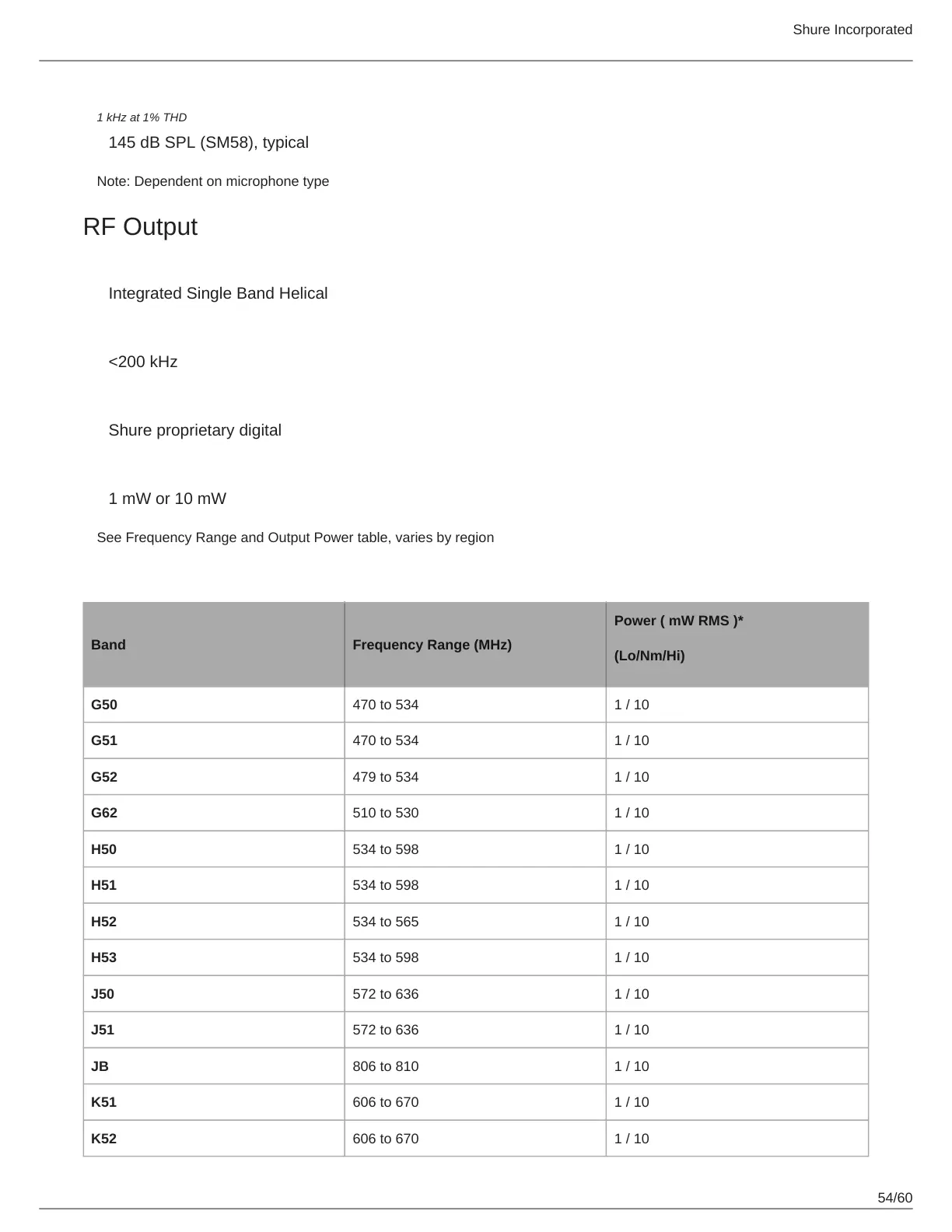 Shure QLXD4 - QLXD2 Specifications - RF Output and Power; RF Output Specifications; Frequency Range and Transmitter Output Power