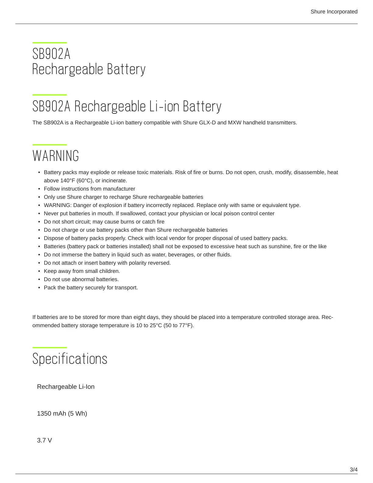 The SB902A is a Rechargeable Li-ion battery compatible with Shure GLX-D and MXW handheld transmitters.