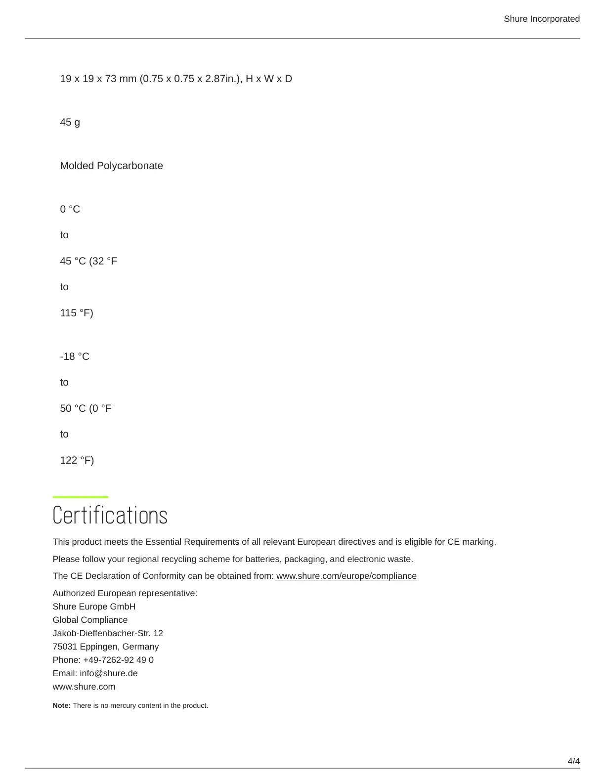 The CE Declaration of Conformity can be obtained from: www.shure.com/europe/compliance
