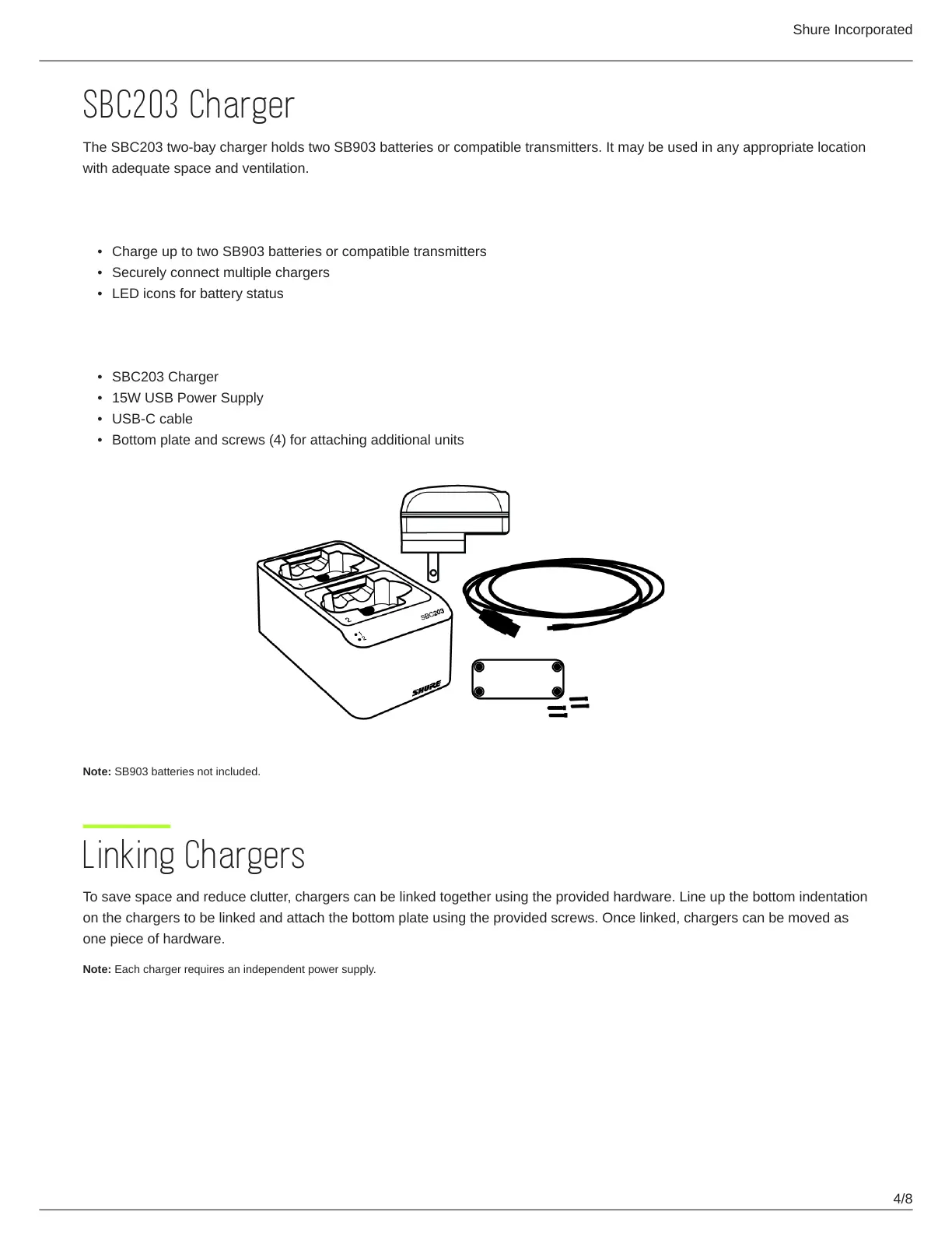 Charge up to two SB903 batteries or compatible transmitters