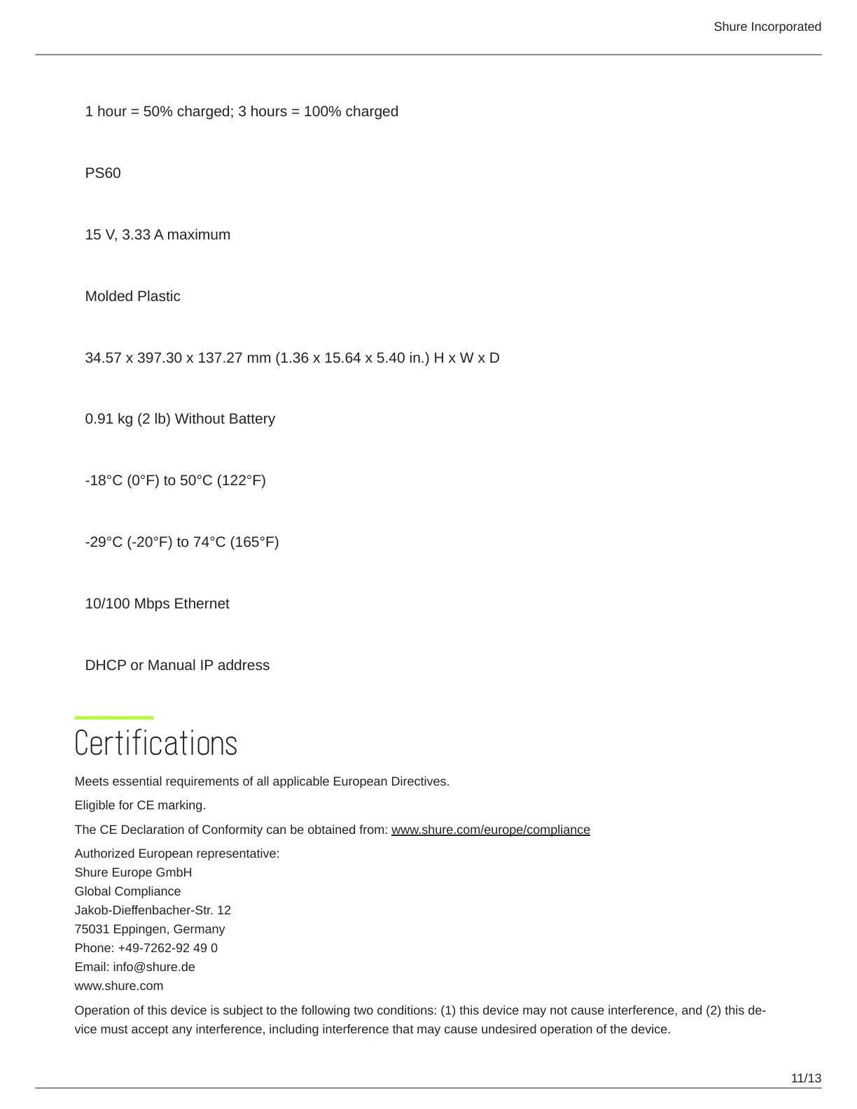 The CE Declaration of Conformity can be obtained from: www.shure.com/europe/compliance