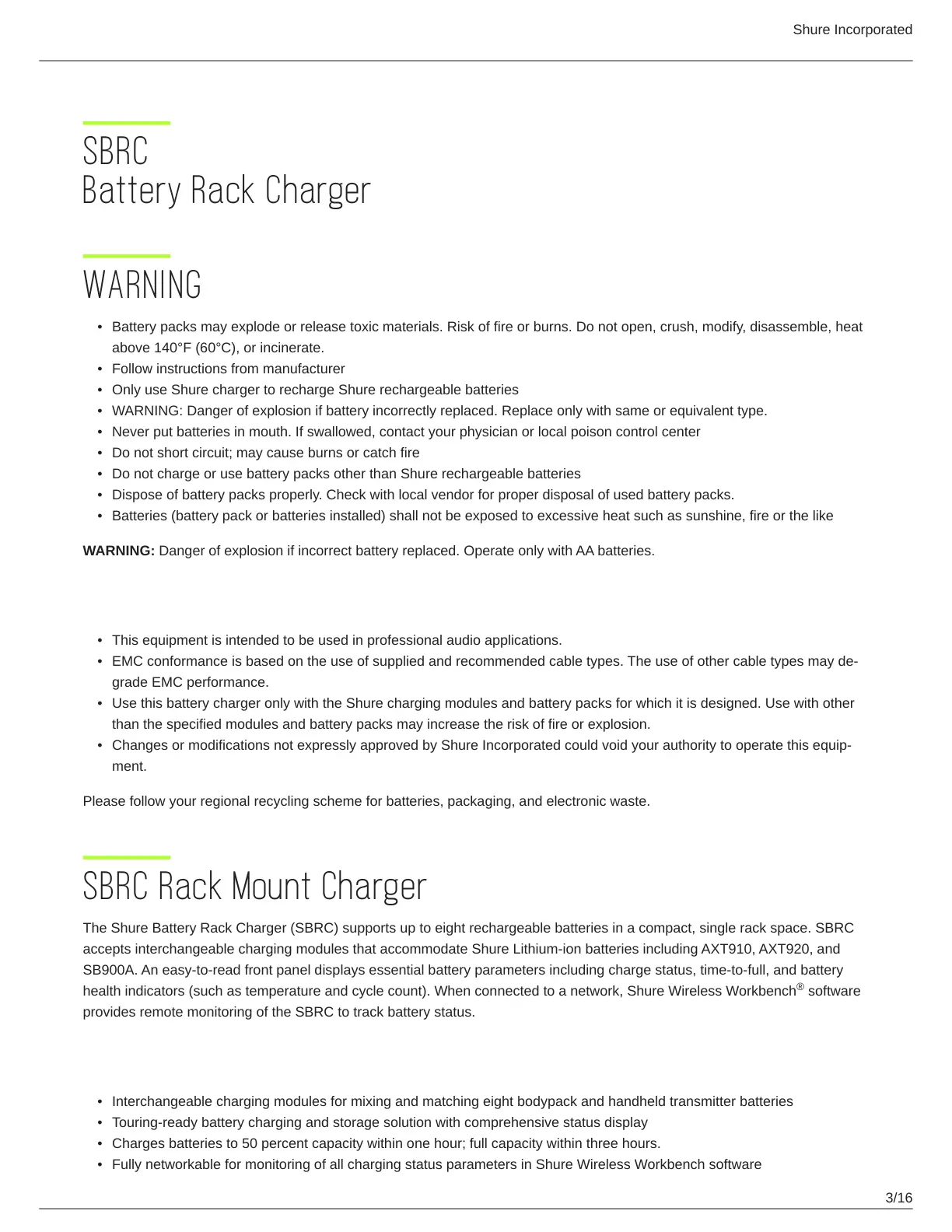 Do not charge or use battery packs other than Shure rechargeable batteries
