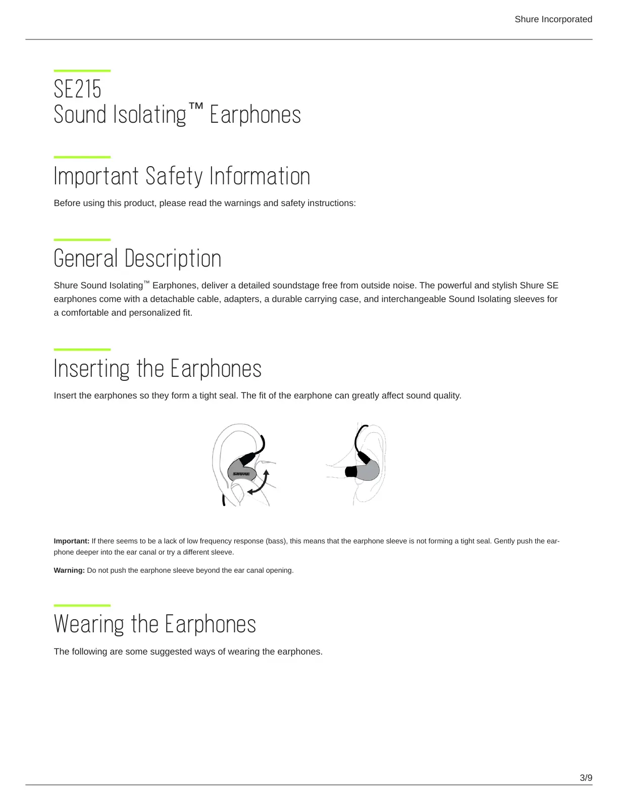 Important: Ifthereseemstobealackoflowfrequencyresponse(bass),thismeansthattheearphonesleeveisnotformingatightseal.Gentlypushtheear