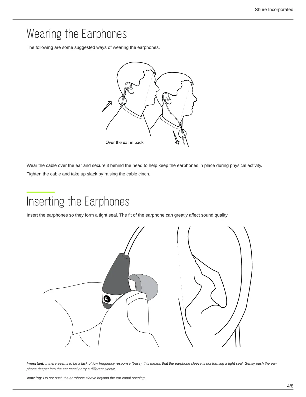 Important: If there seems to be a lack of low frequency response (bass), this means that the earphone sleeve is not forming a tight seal. Gently push the ear