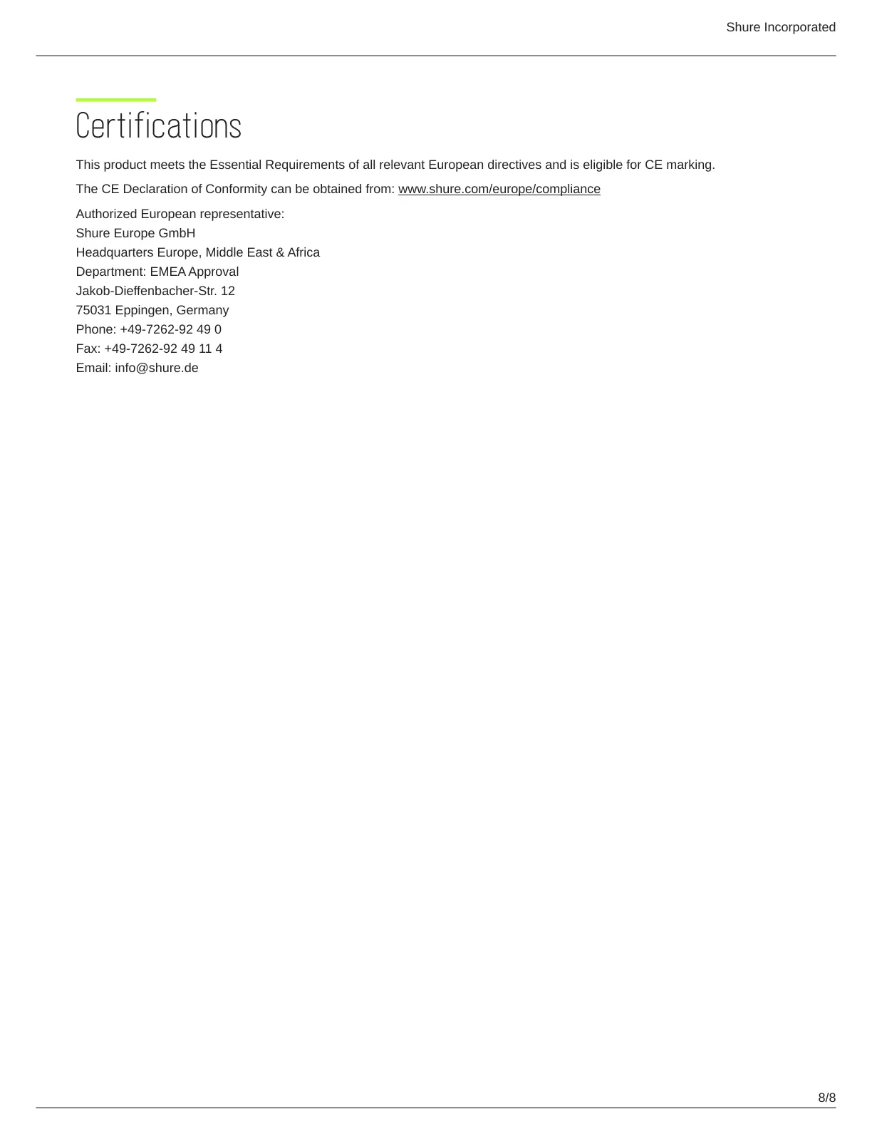 The CE Declaration of Conformity can be obtained from: www.shure.com/europe/compliance