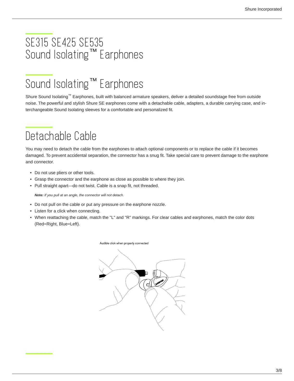 You may need to detach the cable from the earphones to attach optional components or to replace the cable if it becomes