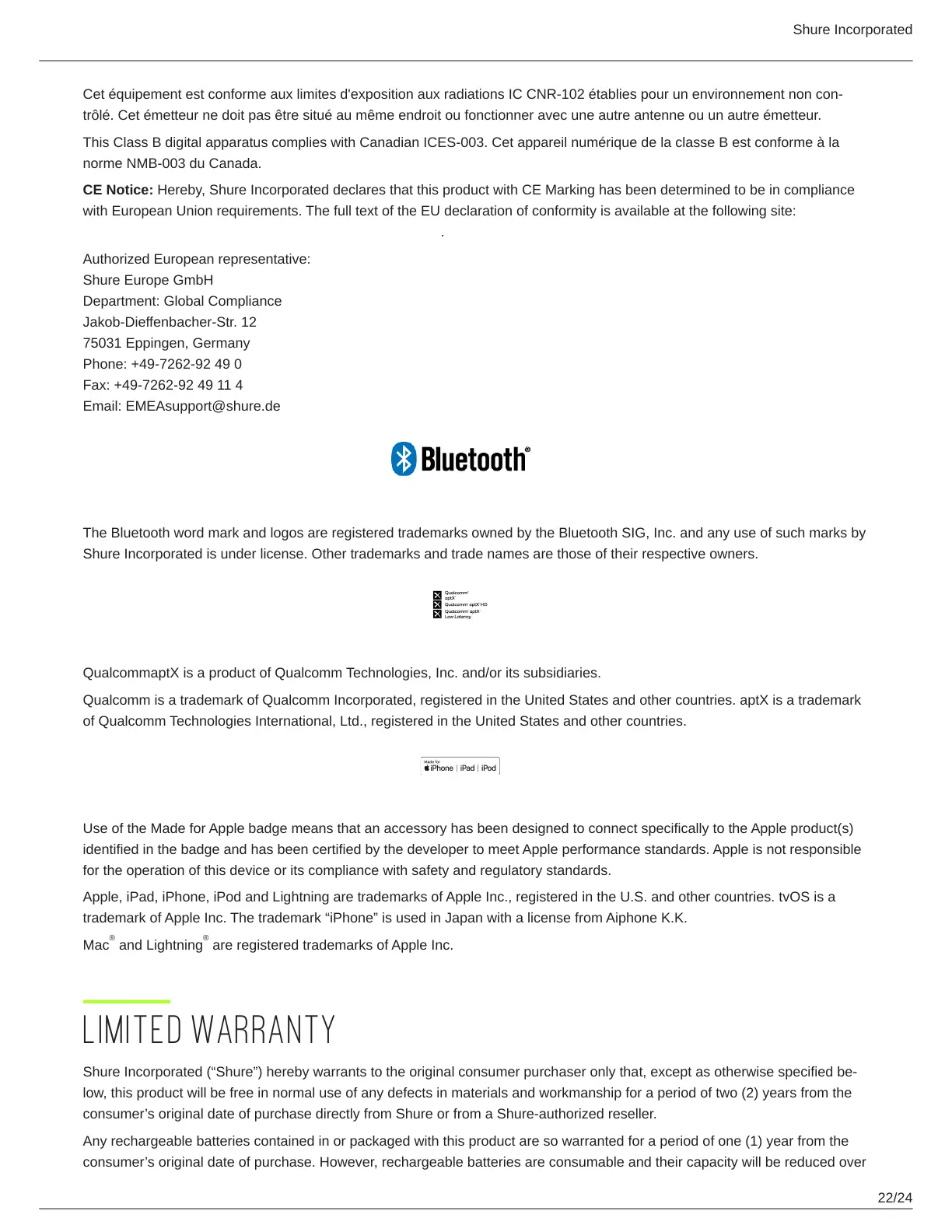 CE Notice: Hereby, Shure Incorporated declares that this product with CE Marking has been determined to be in compliance