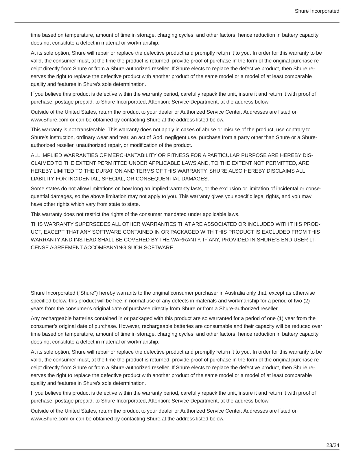 Shure Incorporated ("Shure") hereby warrants to the original consumer purchaser in Australia only that, except as otherwise