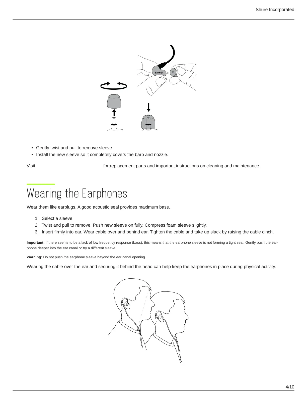 Visit http://www.shure.com/earphones for replacement parts and important instructions on cleaning and maintenance.