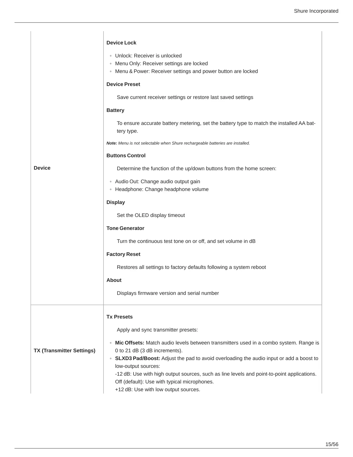 Note: Menu is not selectable when Shure rechargeable batteries are installed.