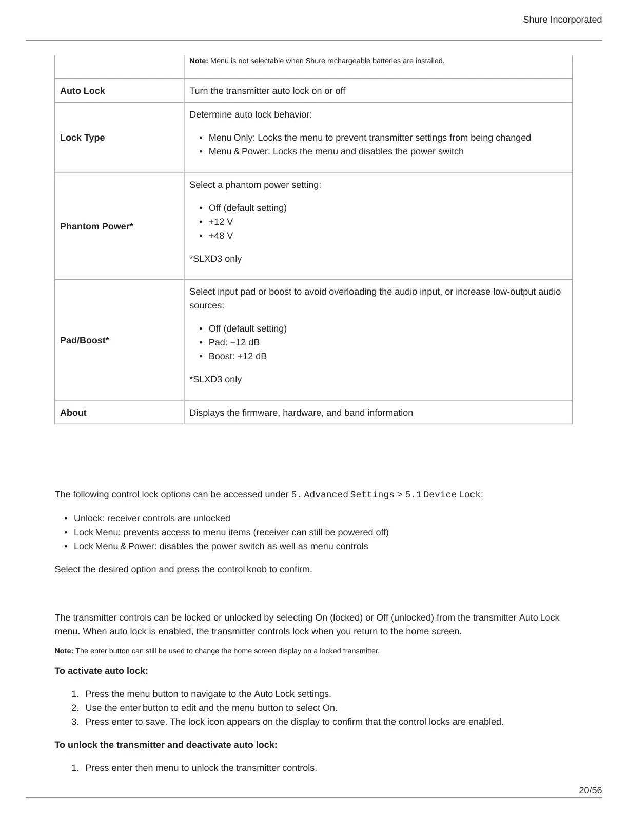 Note: Menu is not selectable when Shure rechargeable batteries are installed.