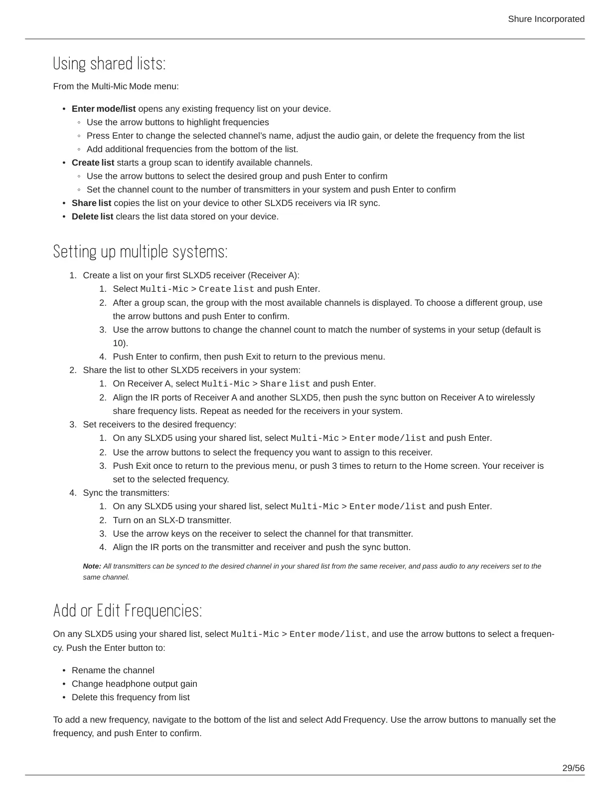On any SLXD5 using your shared list, select Multi-Mic > Enter mode/list, and use the arrow buttons to select a frequen