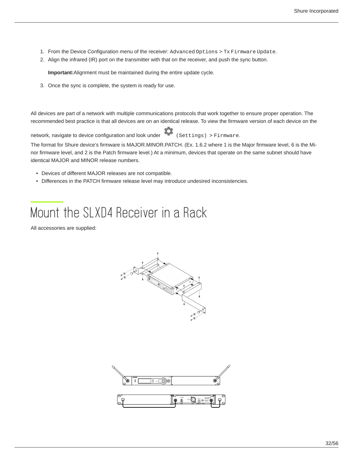 The format for Shure device’s firmware is MAJOR.MINOR.PATCH. (Ex. 1.6.2 where 1 is the Major firmware level, 6 is the Mi