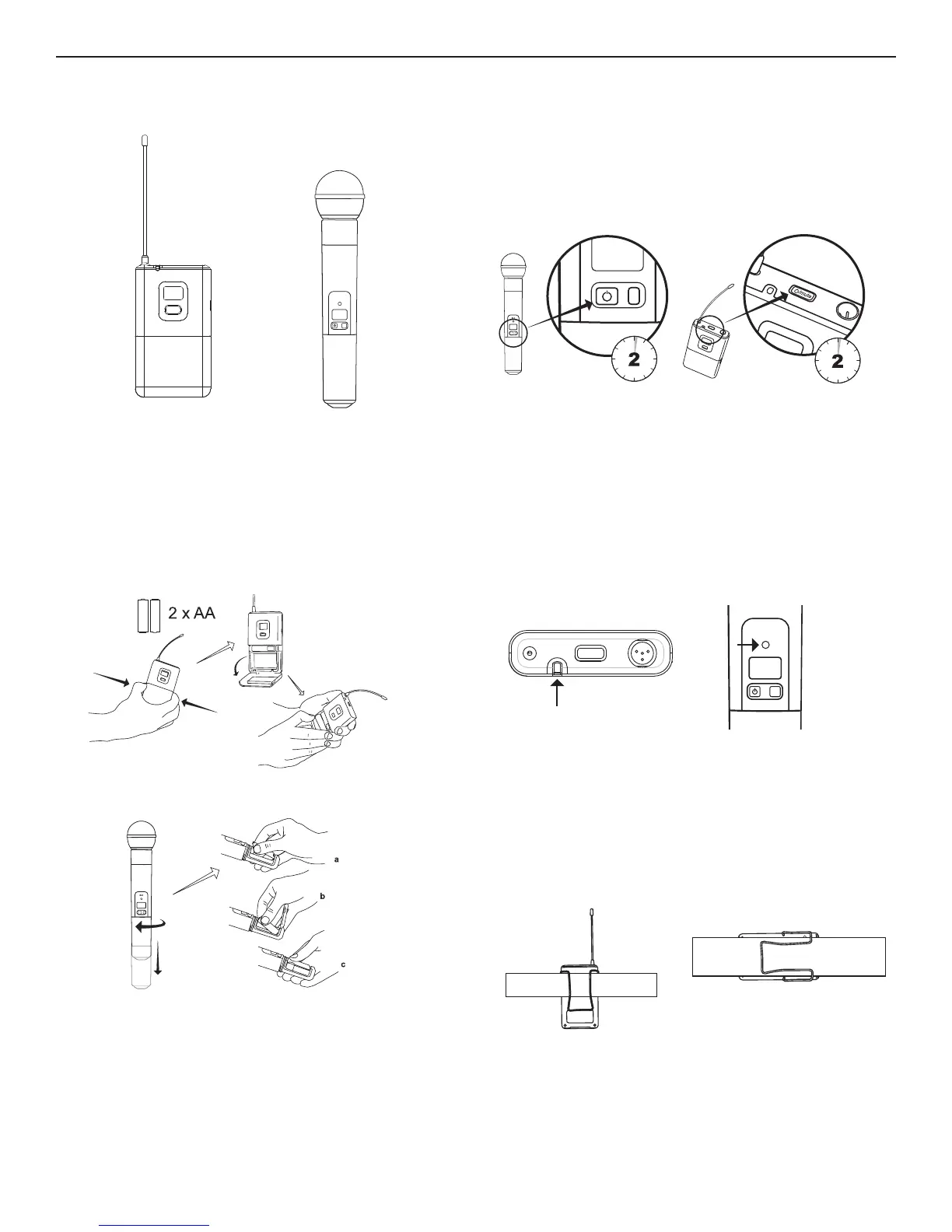 Jepit pemancar pada sabuk atau geser tali gitar melalui penjepit pemancar sesuai petunjuk.