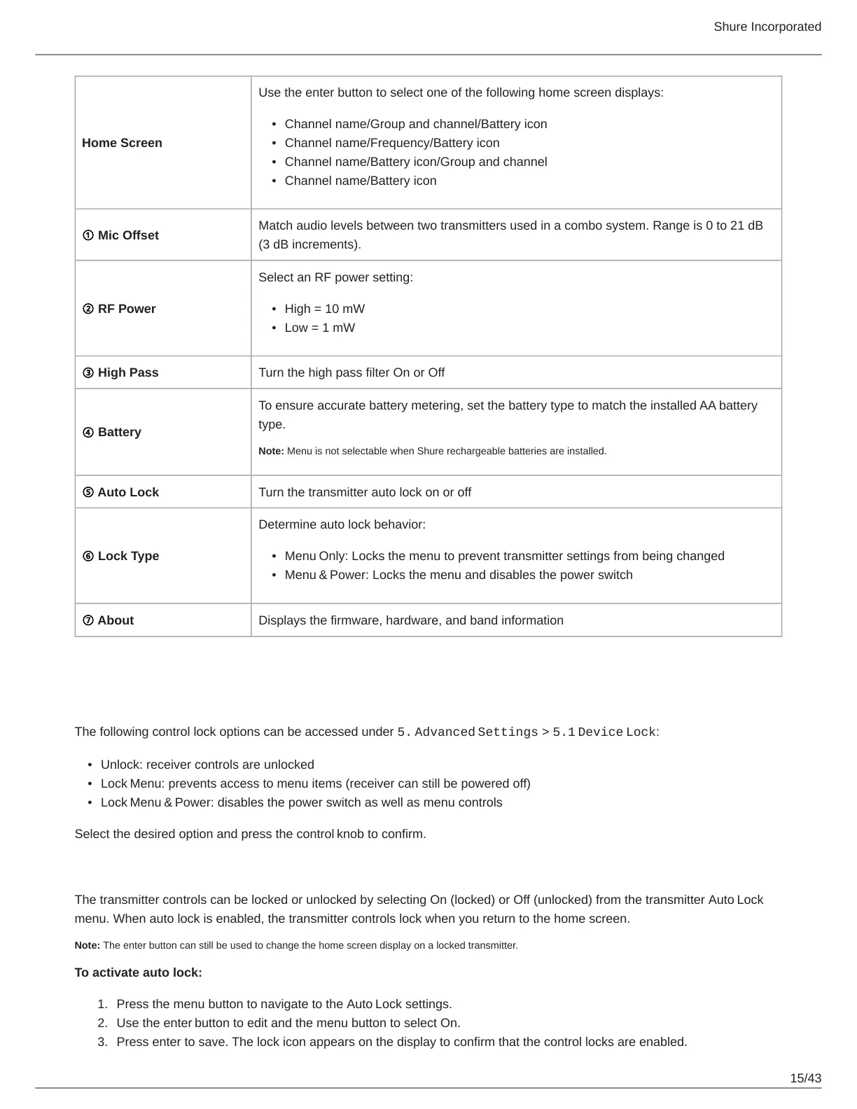 menu. When auto lock is enabled, the transmitter controls lock when you return to the home screen.
