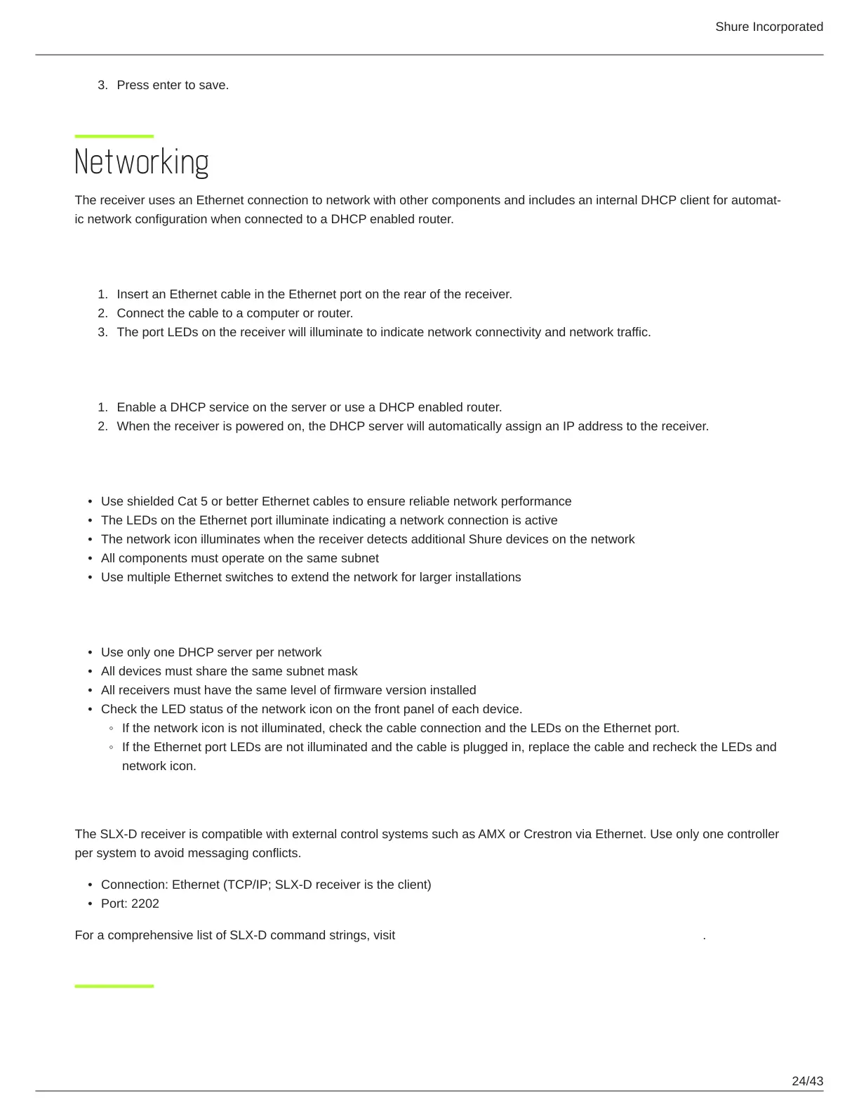 Connection: Ethernet (TCP/IP; SLX-D receiver is the client)