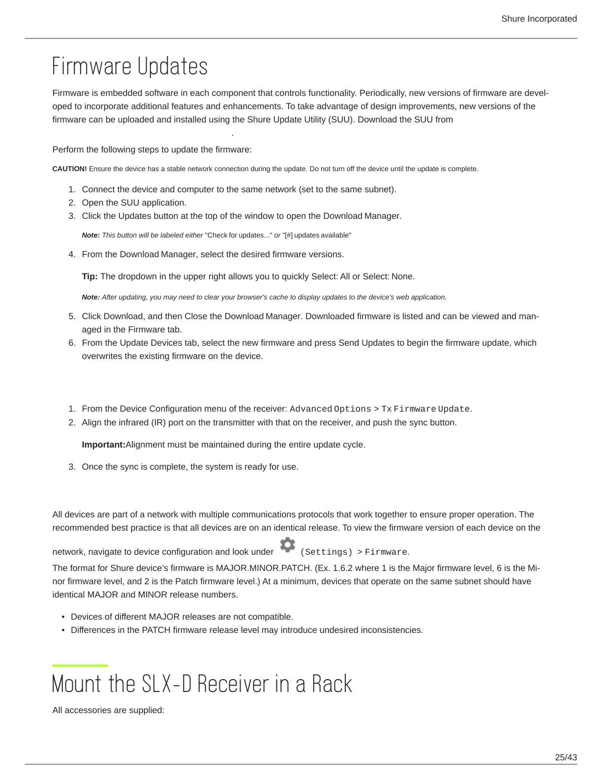 firmware can be uploaded and installed using the Shure Update Utility (SUU). Download the SUU from https://www.shure.com/