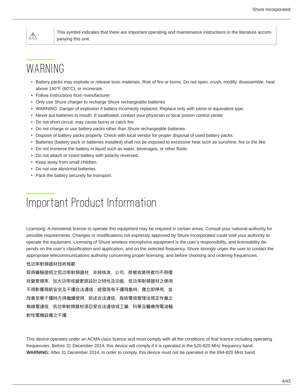 Do not charge or use battery packs other than Shure rechargeable batteries