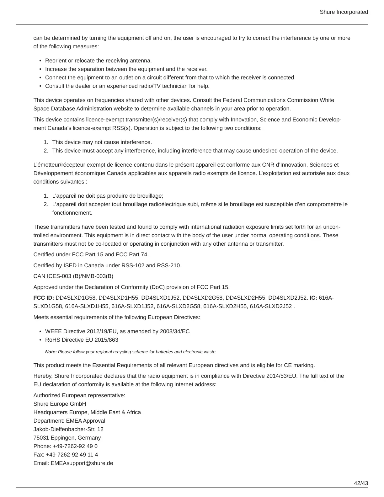 Hereby, Shure Incorporated declares that the radio equipment is in compliance with Directive 2014/53/EU. The full text of the