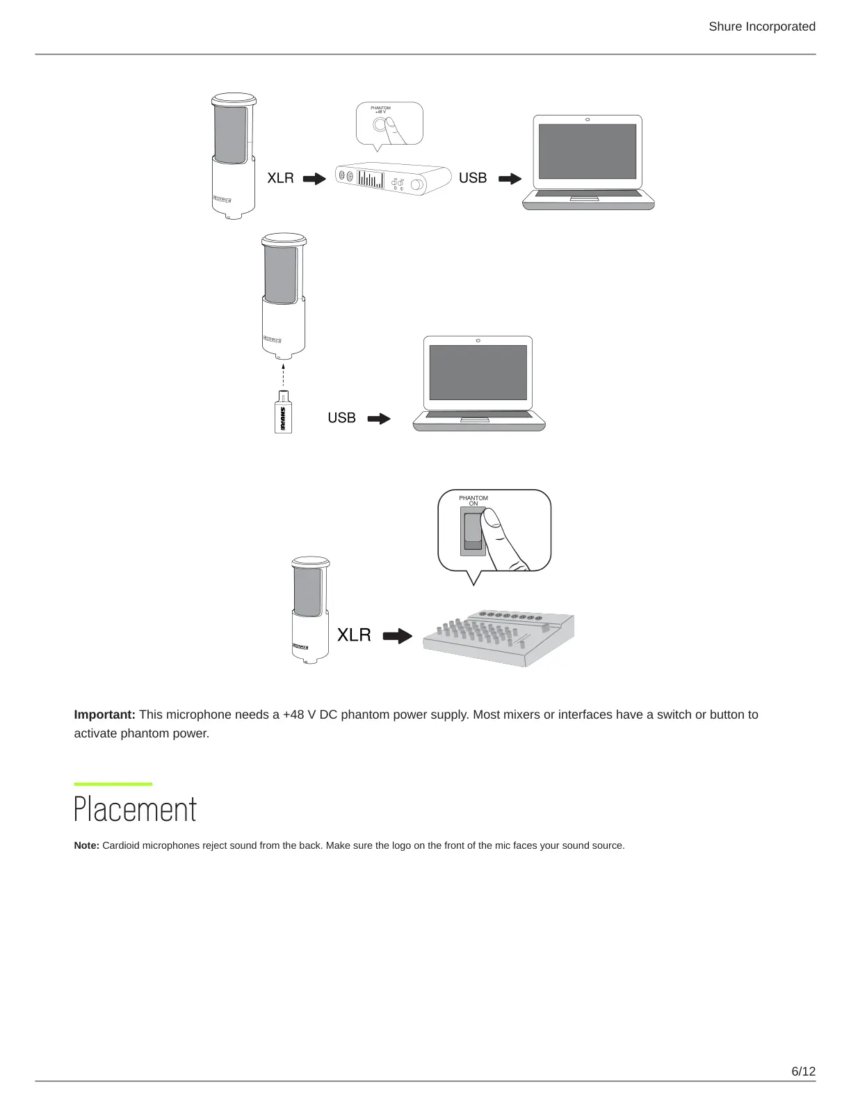 Note: Cardioid microphones reject sound from the back. Make sure the logo on the front of the mic faces your sound source.