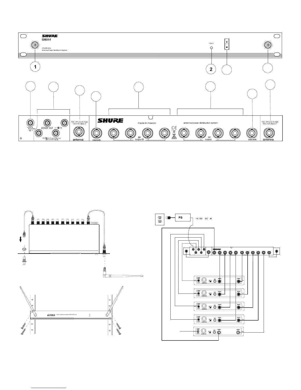 Shure UA844 - Front and Rear Panels Overview; Unit Identification and Controls; Installation and Cabling Guide
