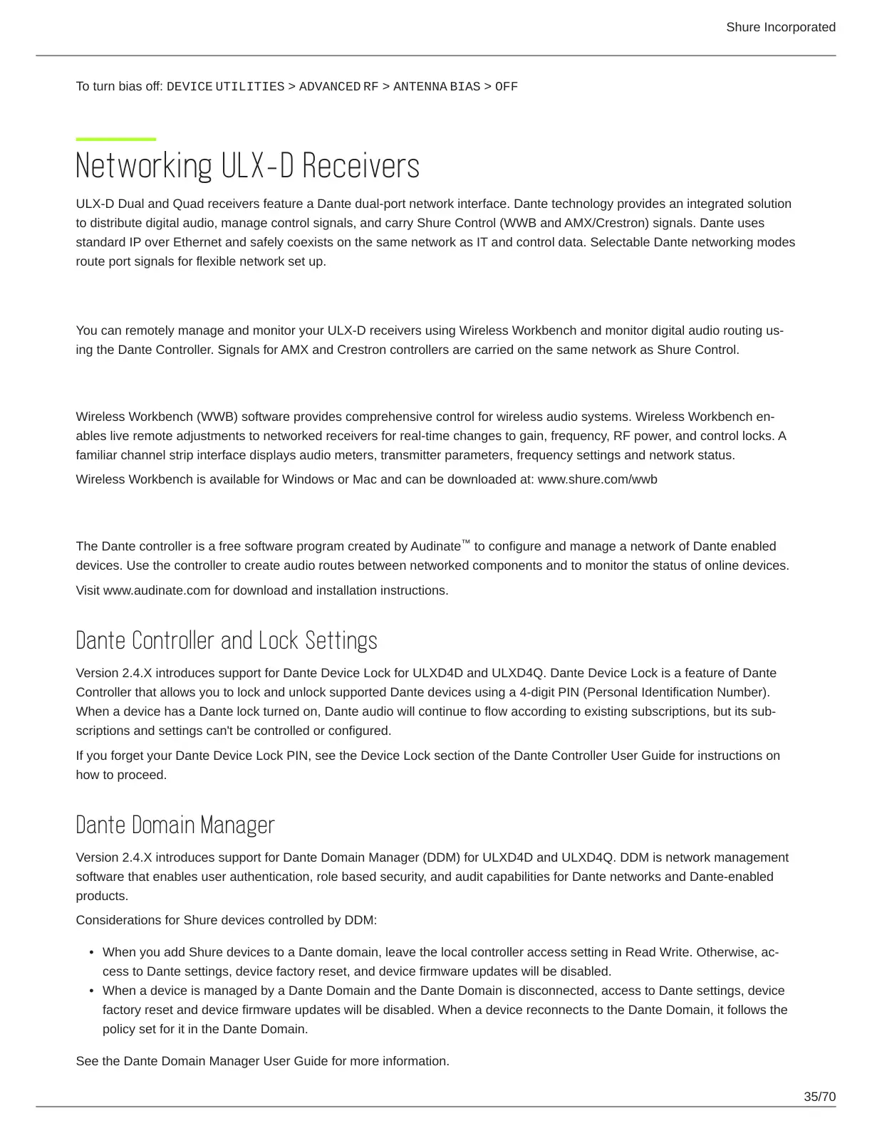 Version 2.4.X introduces support for Dante Domain Manager (DDM) for ULXD4D and ULXD4Q. DDM is network management