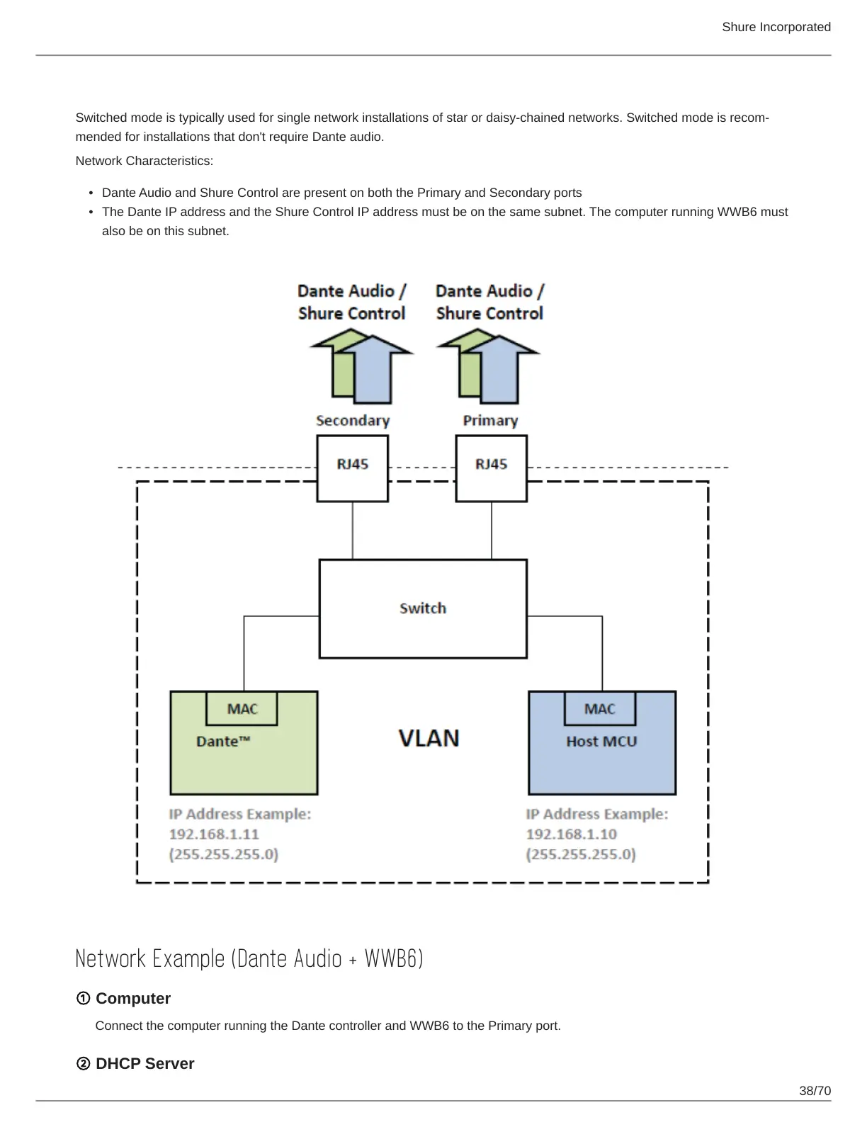 Dante Audio and Shure Control are present on both the Primary and Secondary ports