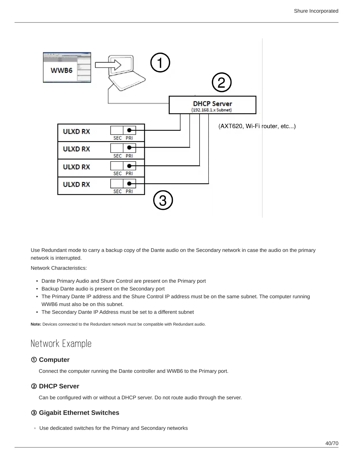 Connect the computer running the Dante controller and WWB6 to the Primary port.