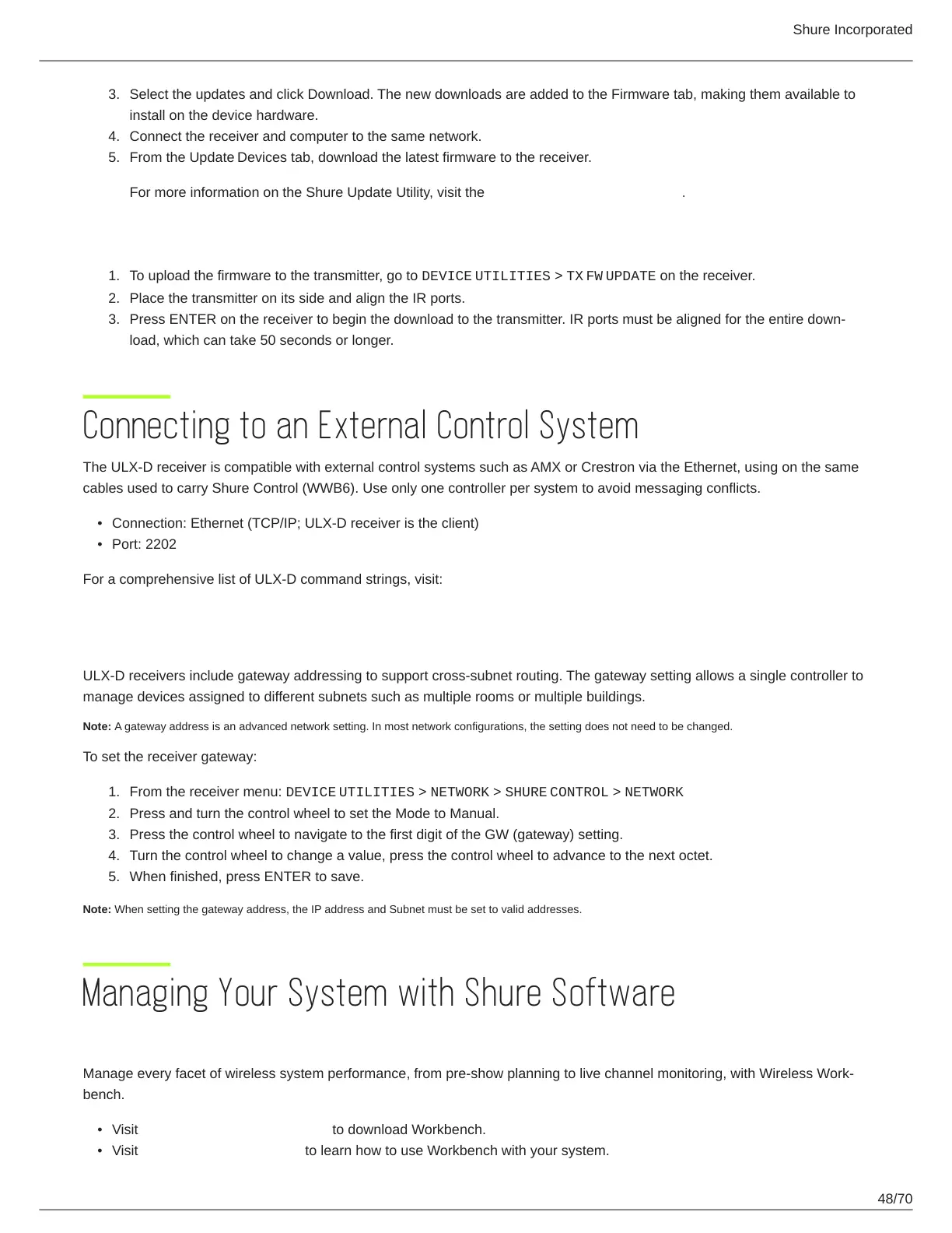 ULX-D receivers include gateway addressing to support cross-subnet routing. The gateway setting allows a single controller to