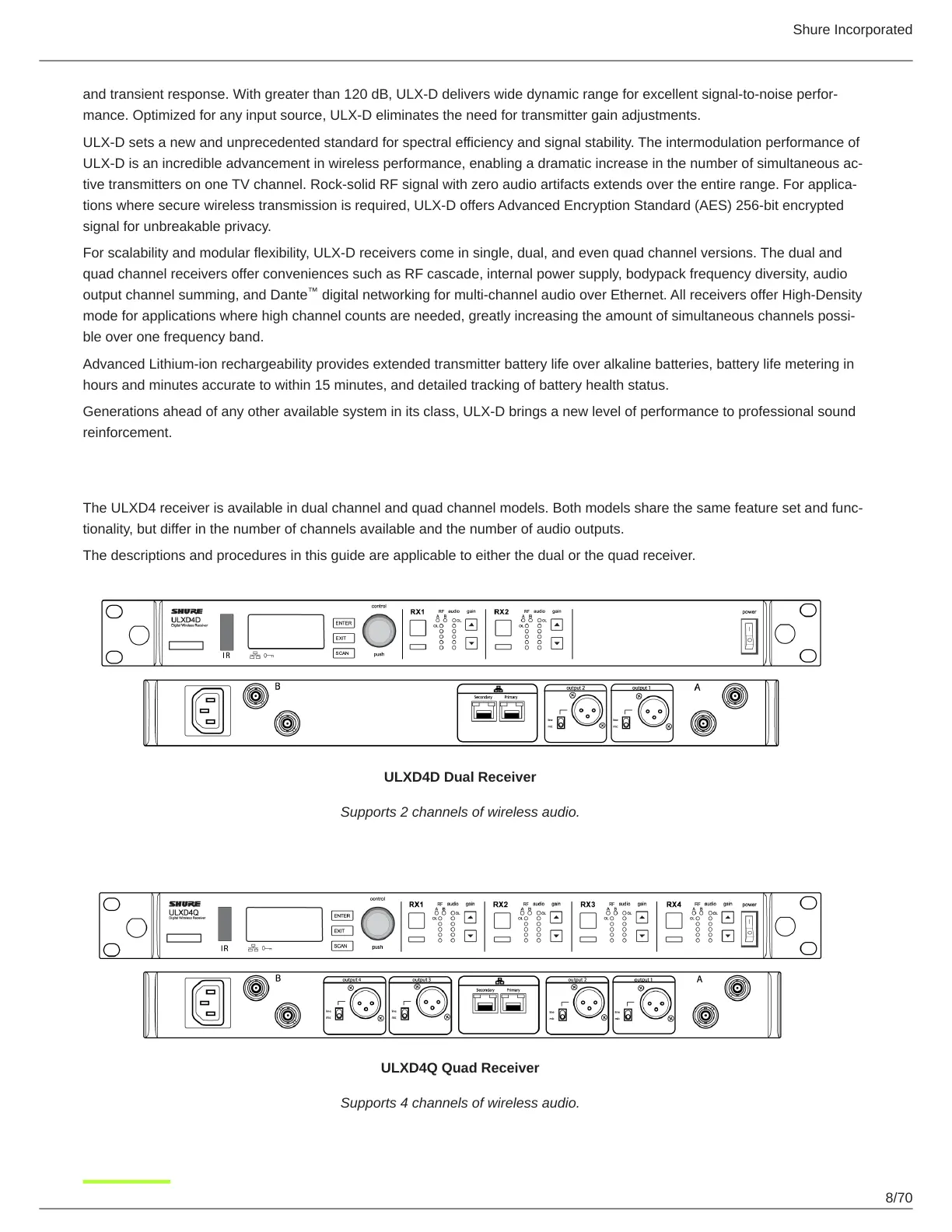 The ULXD4 receiver is available in dual channel and quad channel models. Both models share the same feature set and func