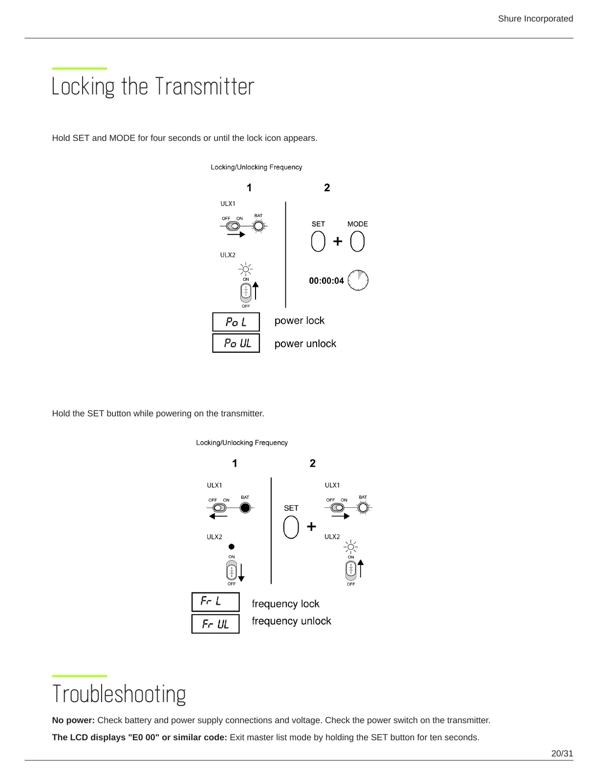Shure ULX - Locking the Transmitter; Lock;Unlock Power (On); Lock;Unlock Frequency; Troubleshooting