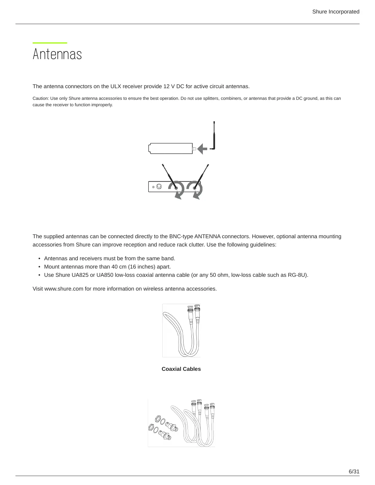 Caution: Use only Shure antenna accessories to ensure the best operation. Do not use splitters, combiners, or antennas that provide a DC ground, as this can